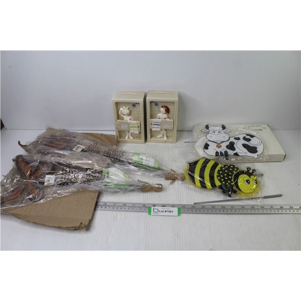 Cow & Bee Whirly Birds - (new) - (2) Metal Yard Decor Items Flower & Butterfly (new) - Male & Female Ceramic Bath Banks