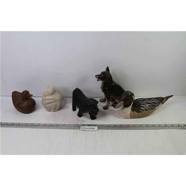 (2) Wooden Ducks - Ceramic Dog - Stone Type Statue - Carved Wooden Lion