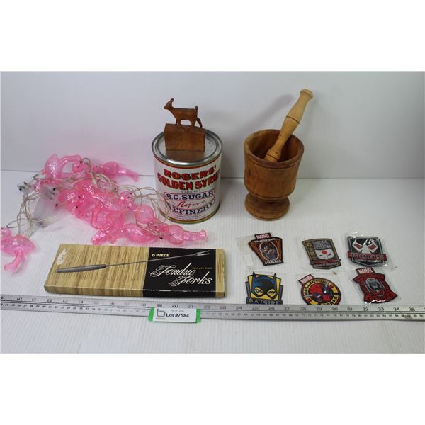 Roger's Syrup Tin - Battery Flamingo String Lights (untested) - Wooden Mortar & Pestle - (6) Piece Fondue Forks - Wooden Deer - Marvel Patches