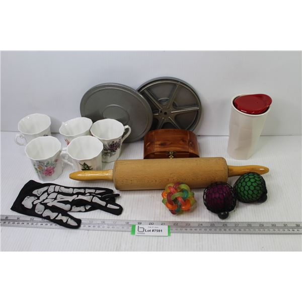 Metal Movie Reel - Rolling Pin - Small Wooden Trinket Box - Ceramic Drinking Cup - Skull Glove - Squishy Balls - (5) Tea Cups (Royal Grafton)