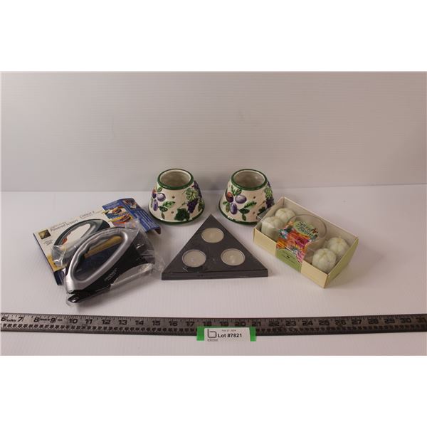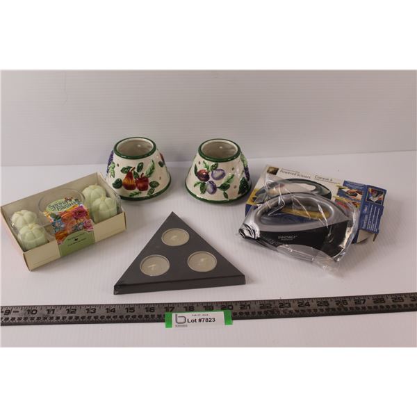 (2) Candle Shades, Power Scissors, (4) Scented Candles w/Holder, Three Tealight Candle Holder