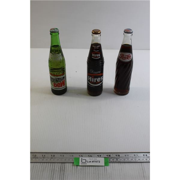(3) Sealed Pop Bottles - Mountain Dew, Hires, Pepsi-Cola