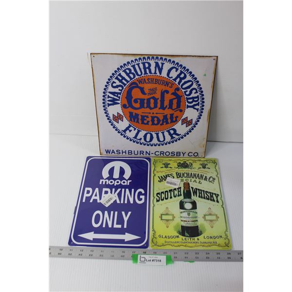 (3) Tin Signs - Whiskey, Flour7318 - (3) Tin Signs - Whiskey, Flour