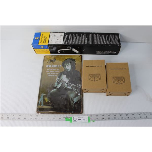 Plastic Drum Pump, Solar Interaction Wall Lamp, Bob Marley Tin Sign