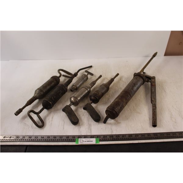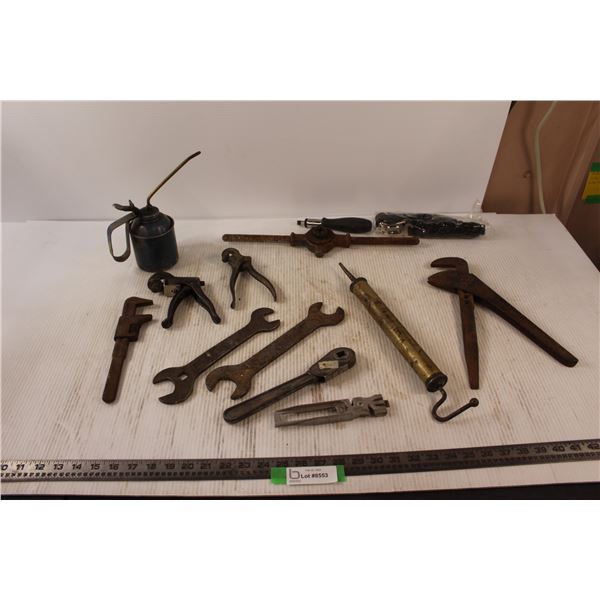 Vintage/Antique Tools - Oil Can, Pipe Wrenches, Open Ended Wrenches, Grease Gun, Die, Knife Sharpener etc.