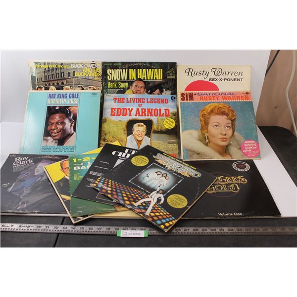 Vinyl LP Records - Hank Snow, Saturday Night Fever, Rusty Warren, Nat King Cole, BeeGees Gold, John Denver etc.