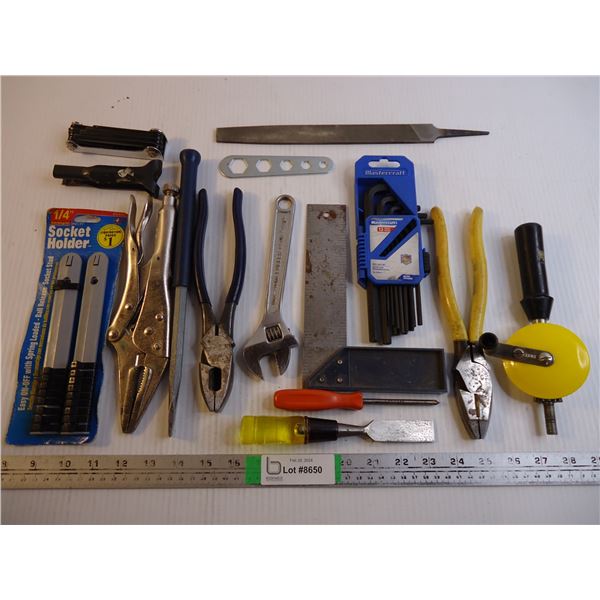 Pliers, Hex key Set, Socket Holder, Square, Chisels and more as pictured