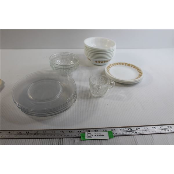 (14) Corelle Dishes and Bowls, (10) Glass Dishes and Bowls, Glass Cup