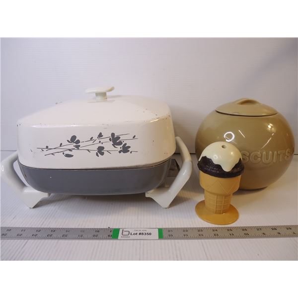 Electric Frying Pan (powers on),Cookie Jar and Plastic Sundae Cup8350 - Electric Frying Pan (powers on),Cookie Jar and Plastic Sundae Cup