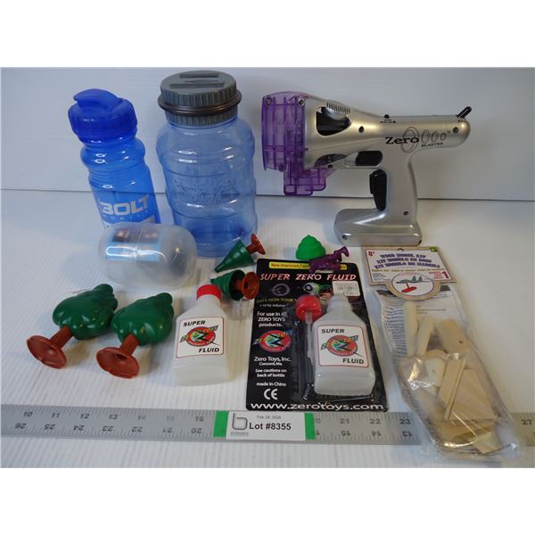 Wood Model Kit, Toy Laser Gun, Coin Bank, Super Zero Fluid, Water Bottle, Star Wars Toy and misc.
