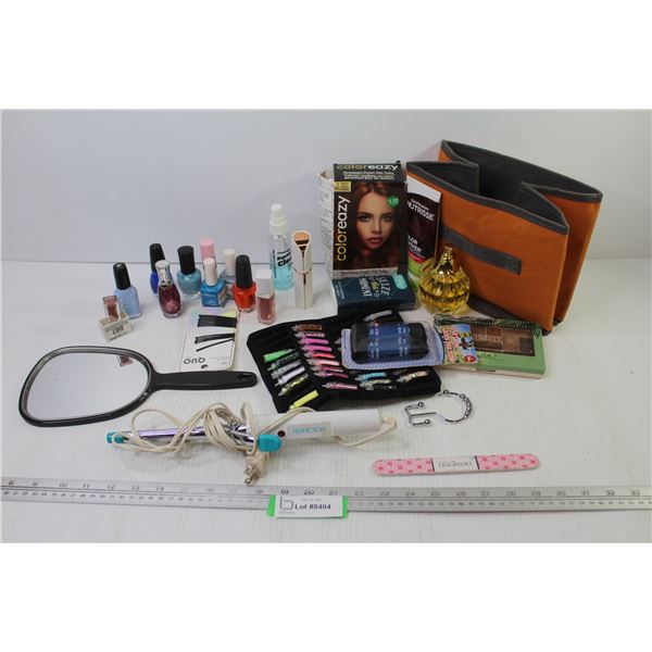 Assorted Cosmetics - Nail Polish - Hair Dye - Curling Iron - Hand Mirror - Perfume