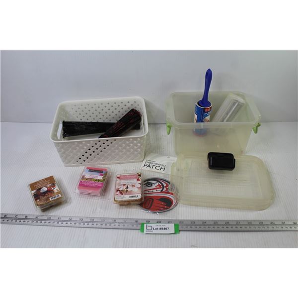 Plastic Container - Embroidered Patch - (2) Hand Fans - Scented Wax Melts - Lint Remover - Ear Buds8407 - Plastic Container - Embroidered Patch - (2) Hand Fans - Scented Wax Melts - Lint Remover - Ear Buds