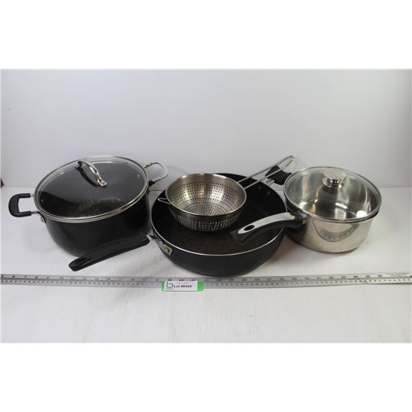 (2) Pots w/Glass Lids - Frying Pan & Strainer8420 - (2) Pots w/Glass Lids - Frying Pan & Strainer