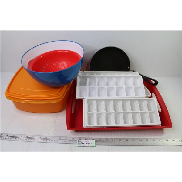 Rubbermaid Container w/Lid - Lg Red Tray - (4) Ice Cube Trays - Sm Frying Pan - Blue Bowl - Plastic 8421 - Rubbermaid Container w/Lid - Lg Red Tray - (4) Ice Cube Trays - Sm Frying Pan - Blue Bowl - Plastic