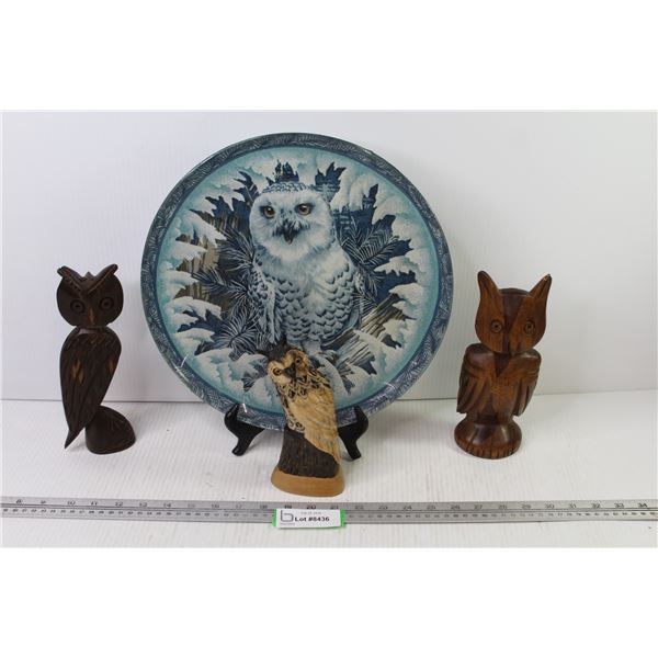 Fabric Owl Design Glass Plate (13" on Stand) - (3) Carved Wood Owls