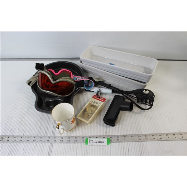 Cake Tin, Kitchen Utensils, Saskatchewan Mug, (2) Ceramic Baking Dishes, Ski Goggles, etc.