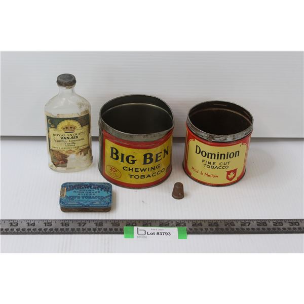 (3) Antique Tobacco Tins, Vanilla Extract Glass Bottle, Thimble