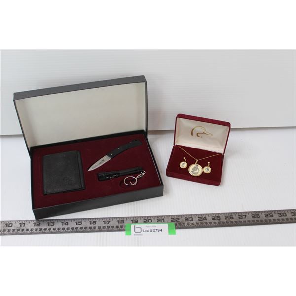 Ducks Unlimited Lot: Earrings & Necklace Set, Wallet, Knife, Flashlight Set
