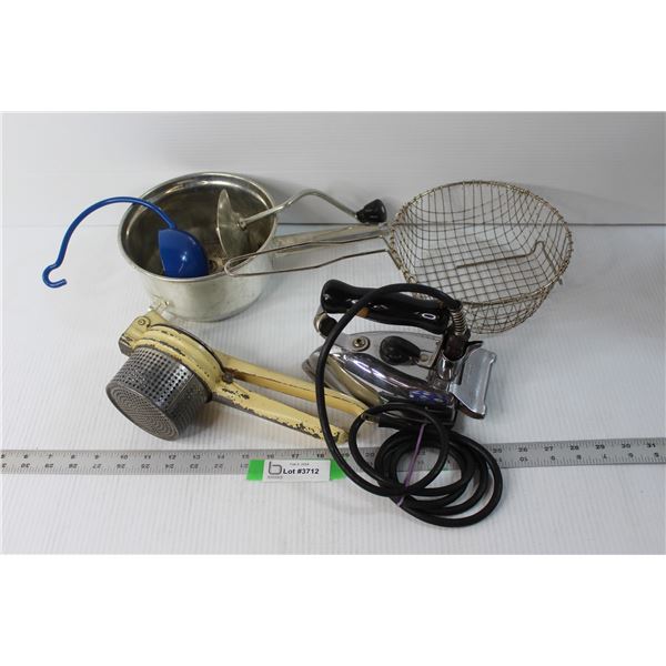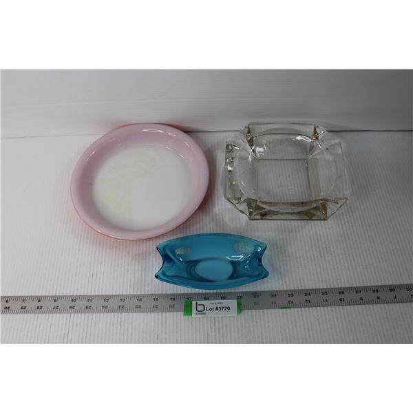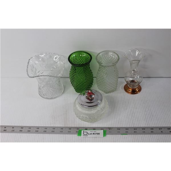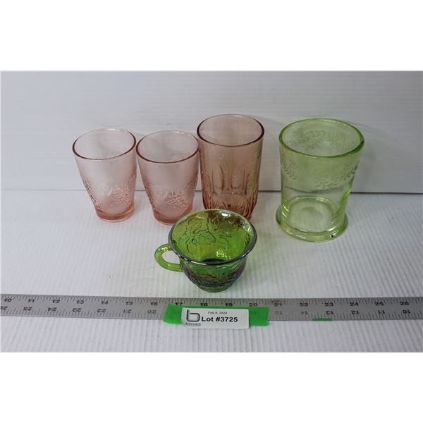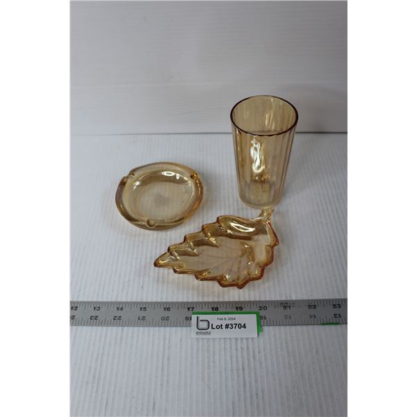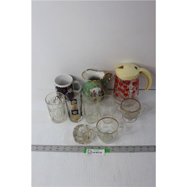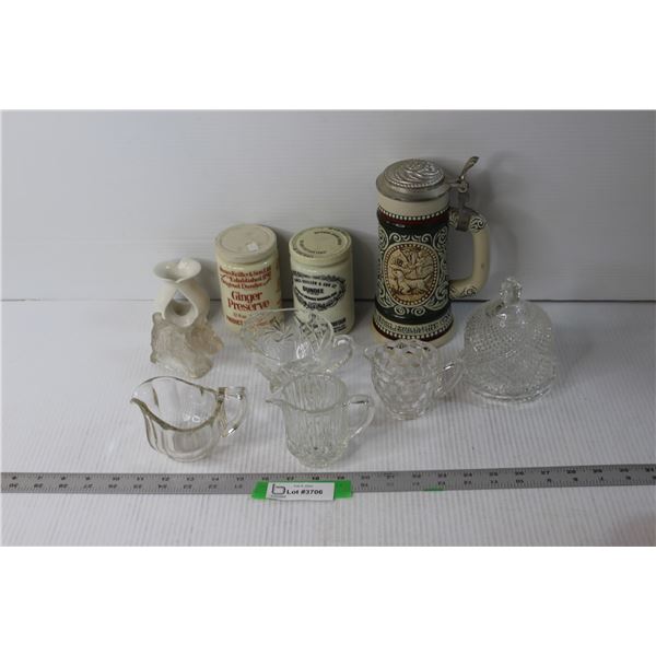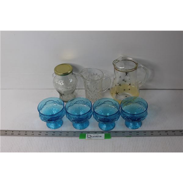 (4) Anchor Hocking Peacock Footed Dessert Cups, Gold Star Pitcher, Misc