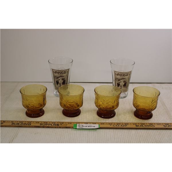 (2) Coca Cola, (4) Libbey Amber Juice Glasses