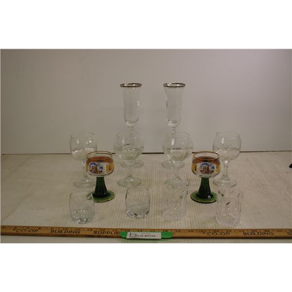 (4) White Wine Glasses, (4) Crown Royal Shot Glasses, (2) Champagne, (2) München Liquor Glasses