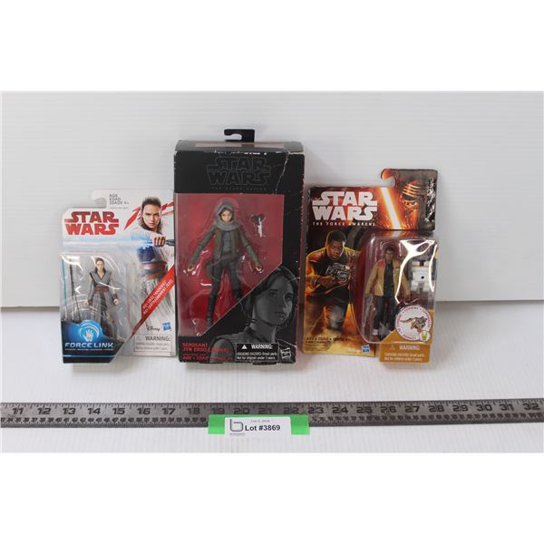(3) Star Wars Figurines: Rey, SGT Jyn Esro, Finn