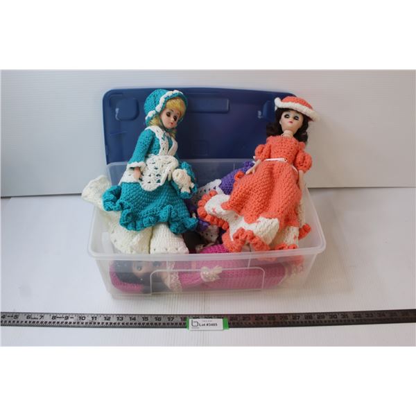 (4) Dolls in Crocheted Dresses, In Storage Case