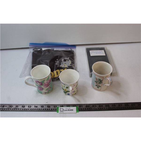 (2) Tee Shirts - New, (3) Mugs, VHS Tape