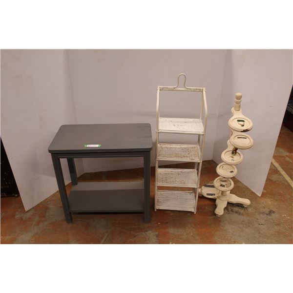 * Wooden End Table, Wicker Shelf Unit, Wooden Plant Stand