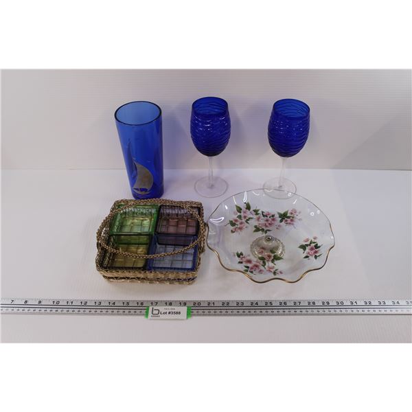 (2 Goblets, Blue Glass, Pedestal Glass Tray, Fancy 4 Compartment Basket3588 - (2 Goblets, Blue Glass, Pedestal Glass Tray, Fancy 4 Compartment Basket