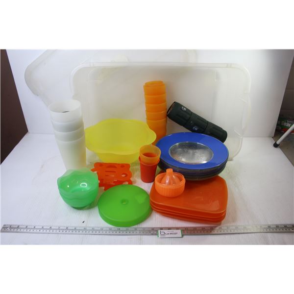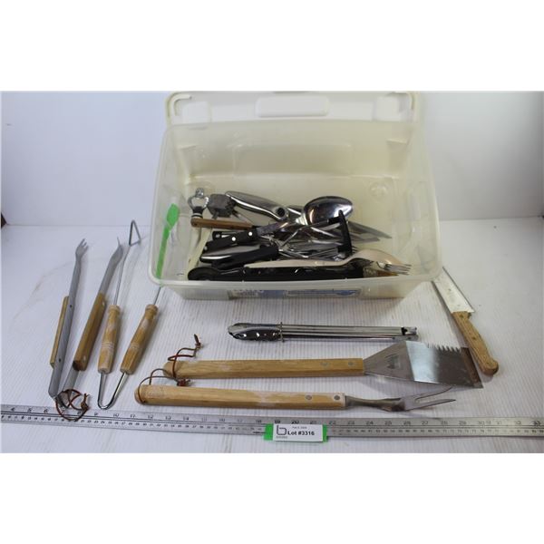 Plastic Container w/ Assorted Cutlery & Kitchen Ware Items