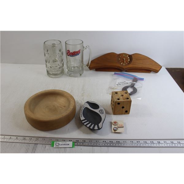 Antique Bottle Opener, (2) Glass Beer Mugs, Misc.