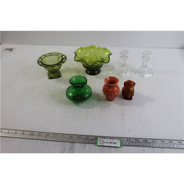 (2) Candy Dishes, (2) Candleholders, Misc.