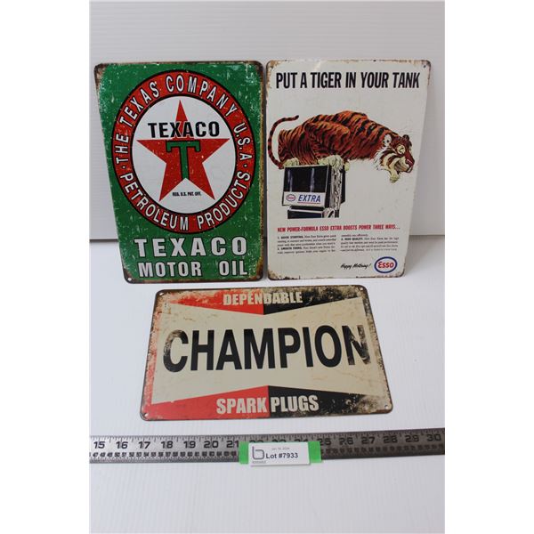 (3) Metal Collector Signs - Esso, Texaco, Champion Spark Plugs