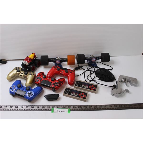 (4) PS4 Controllers, (2) Nintendo Controllers, PC Mouse, Skateboard Trucks, Liquor Gun, Tonka Monster Truck