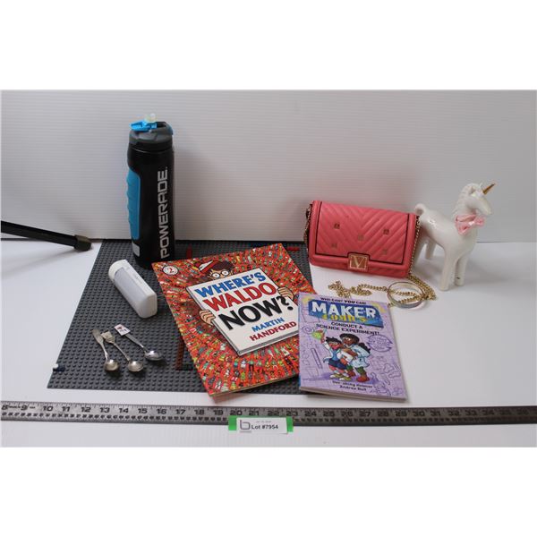 Powerade Water Bottle, Nightlight, Where's Waldo, Lego Build-It Square, Victoria's Secret Purse, Unicorn Decor, Maker Comics Science Book, (...