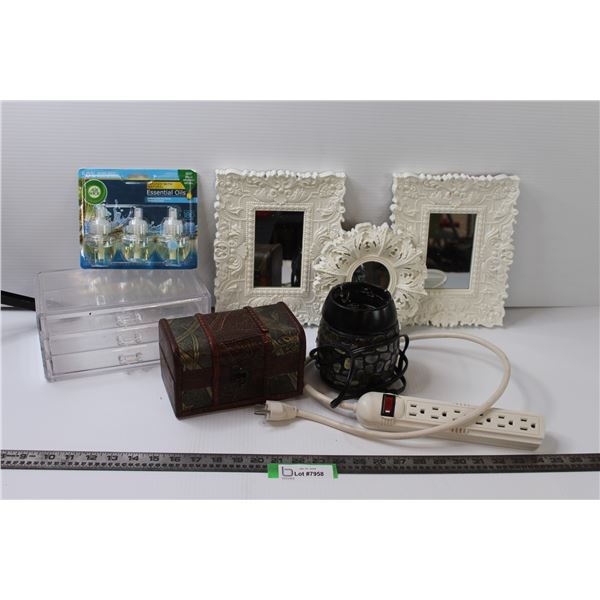 (3) White Mirror Wall Decor, PartyLite Wax Melter & Power Bar, (2) Organizers, AirWick Scents