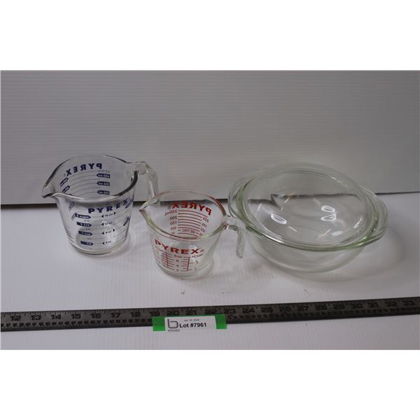 Pyrex 1.5 Quart Glass Dish w/Lid, (2) Pyrex Measuring Cups7961 - Pyrex 1.5 Quart Glass Dish w/Lid, (2) Pyrex Measuring Cups