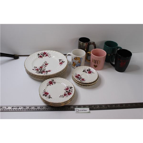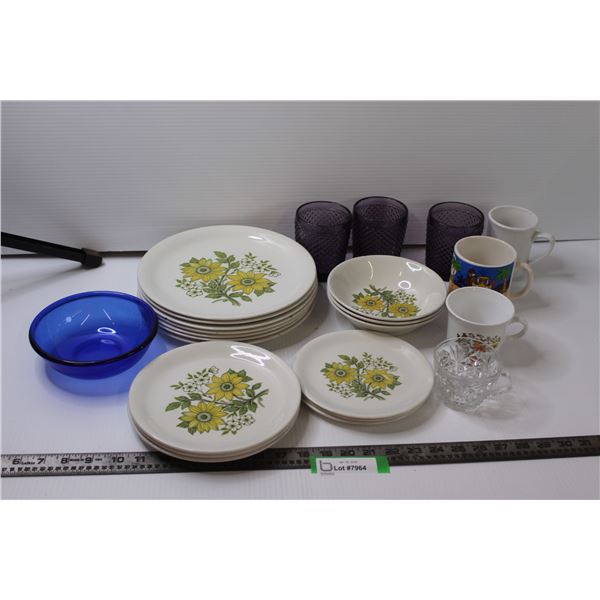 Wood & Sons Greenwood Plate Collection Made in England, (4) Assorted Mugs, (3) Purple Glasses, Blue Glass Bowl