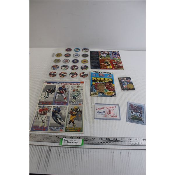 NFL Lot - Pinheads Key Chain, Football Coin, Assorted 1993 Classic NFL Team Logos and Player Discs, Pinnacle Mint Coin and Card, McDonald's 1993...