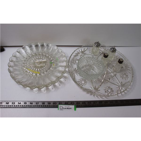 (4) Federal "Heirloom" Glass Plates, Candy Dish, Serving Platter, (2) Salt & Pepper Shakers