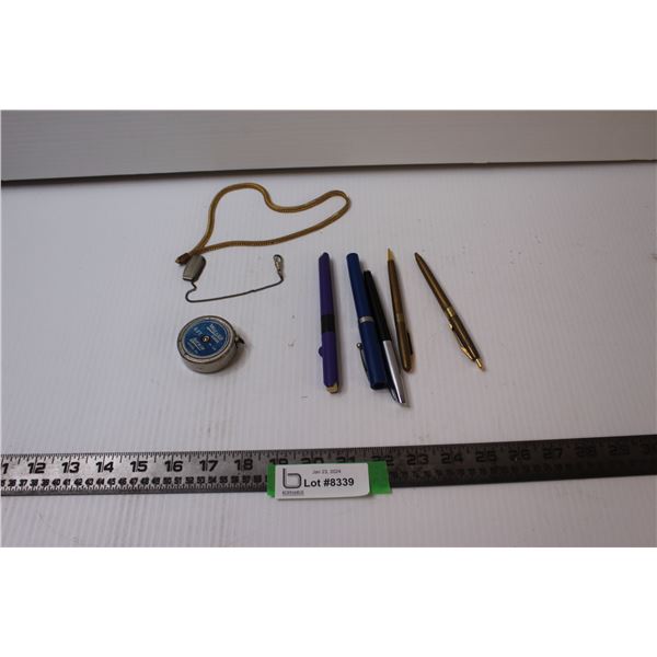 Collector Tape Measure, Watch Fob, Gold Coloured Jewellery Chain, Fountain Pens, etc.