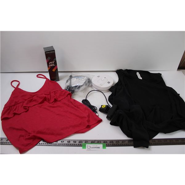Pink Women's Top (XS), Women's Black Tank Top (10), Headset, Fire Detector, Charger, Fit Gel
