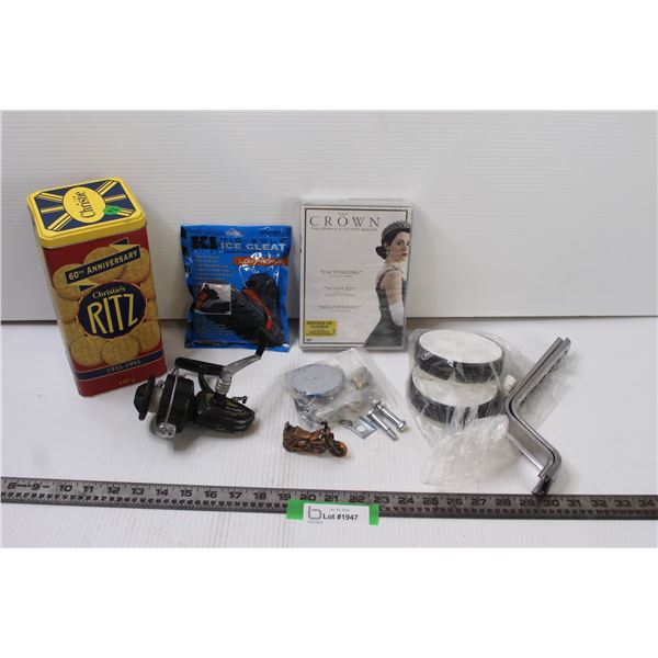 The Crown Season 1-2, Ritz Tin Container, Fishing Reel, Set of Training Wheel, Ice Cleats, Motorcycle Lighter