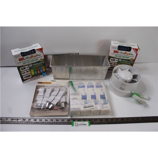 (2) Blue Christmas Lights in Boxes, Metal Plant Box w/Lid, Sheet Fasteners, (4) Water Filter Replacements for Kenmore/LG, Duct Fan - As Is