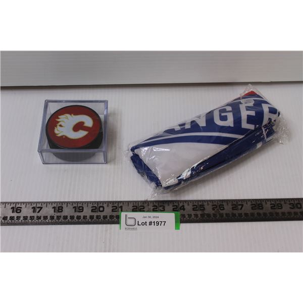 Montreal Canadians Hockey Puck, New York Rangers Flag - Unopened