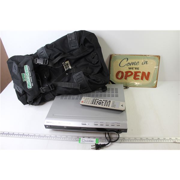 Team Saskatchewan Backpack - Tin Open Sign - Zenith DVD Player w/Remote (powers on)3563 - Team Saskatchewan Backpack - Tin Open Sign - Zenith DVD Player w/Remote (powers on)