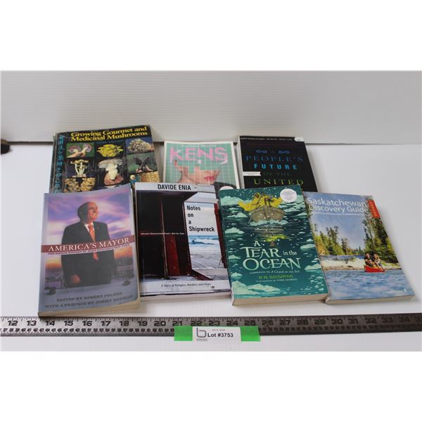 (7) Books : Mushrooms, United States Politics Books, Saskatchewan Discovery Guide, A Tear in the Ocean