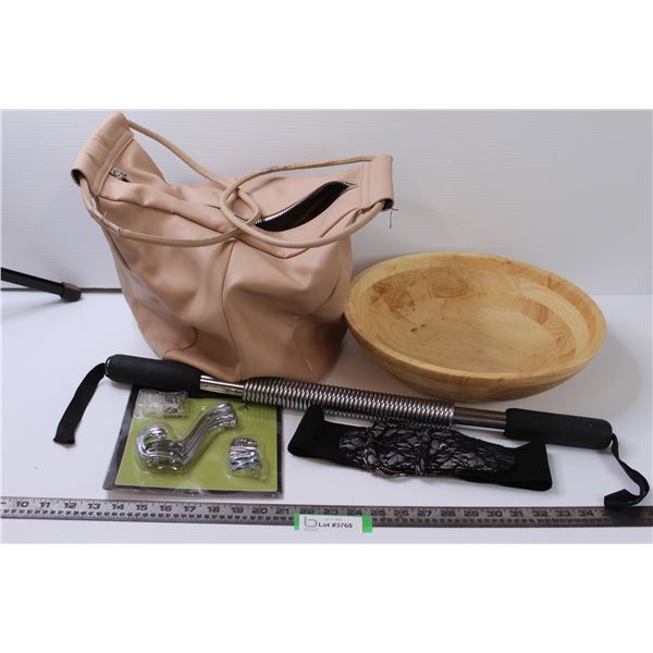 Women's Purse, Wood Serving Bowl, Ladies Belt, Wall Hooks, Tension Workout Bar
