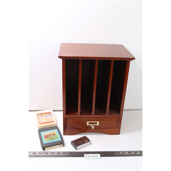 Wooden Desk Organizer (12"x9"x15.5")(Some Wear), (2) 8-Tracks: Beach Boys, Rock 60's, Zippo Lighter Cover